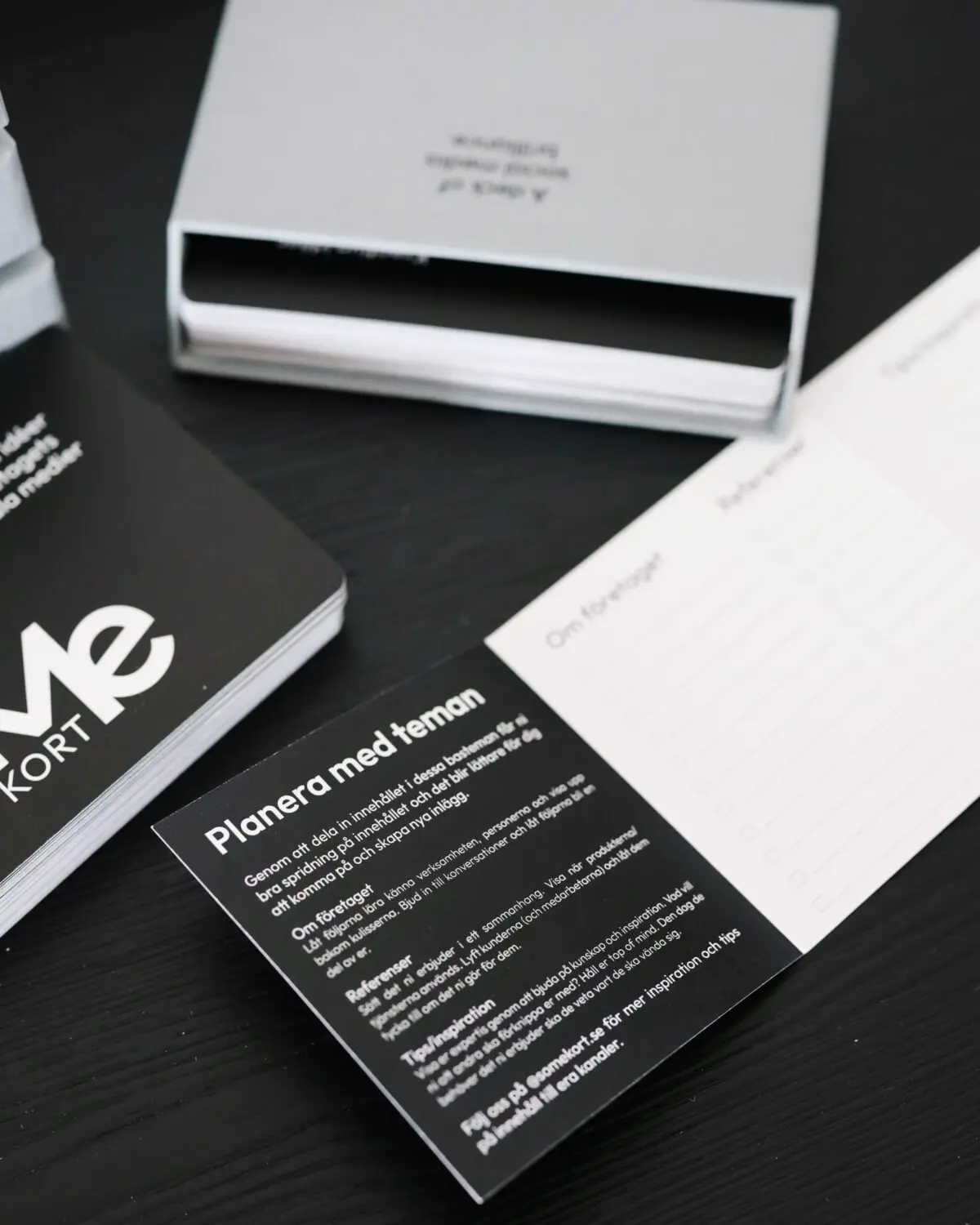 SoMe-korten består av 50 mattlaminerade kort (stl A6) med olika teman. På baksidan hittar du en mängd idéer på innehåll du kan skapa inom det temat. De levereras i en snyggt designad ljusgrå box att ställa på skrivbordet. Dra ett kort och kickstarta flödet av idéer. När det är dags att planera kan du ta ett gäng kort och sprida ut på bordet, plocka det du dras till och börja skapa innehåll.